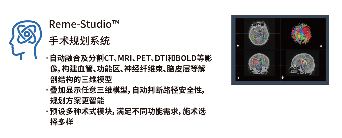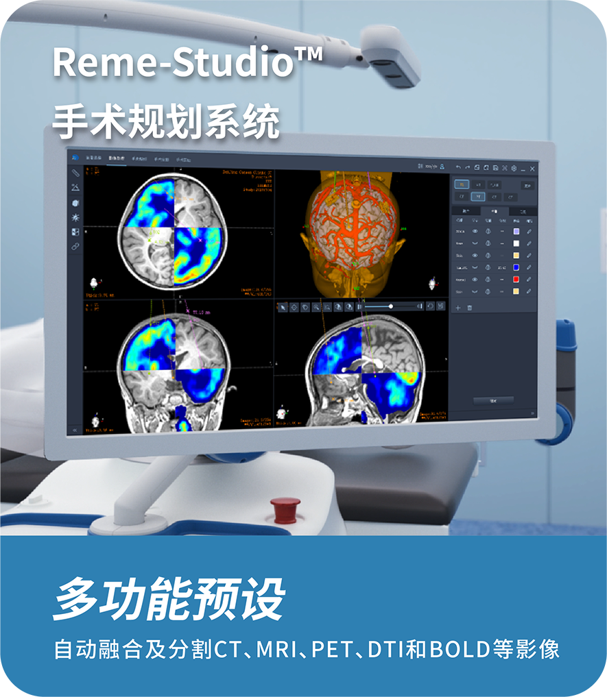 Q:What features does the Reme? surgical planninA:The surgical planning software can achieve multimodal image fusion including CT, MRI, PET, DTI, etc., multiple tissue segmentation, and advanced image processing functions to meet the various needs of neurosurgical image processing and surgical planning.
